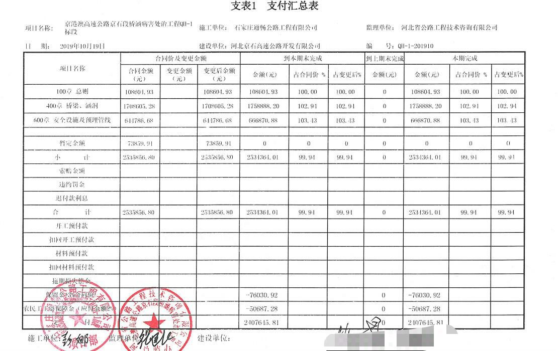 京港澳高速公路京石段橋涵病害處治工程QH-1標段工程支付證書