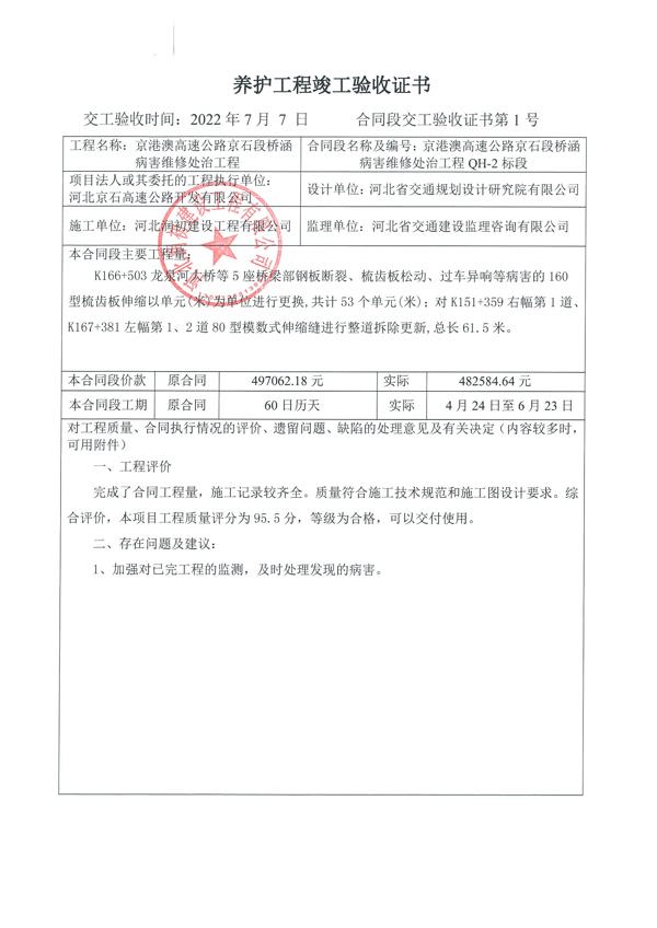 2022年橋涵病害維修處治工程QH-2標(biāo)驗收證書