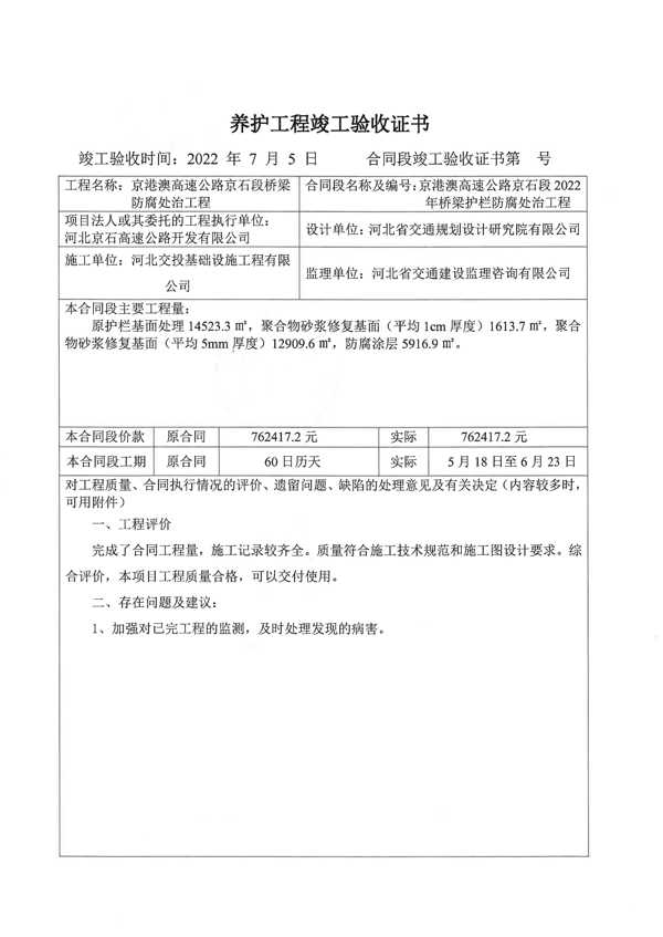 京港澳高速公路京石段2022年橋梁護(hù)欄防腐處治工程驗(yàn)收證書
