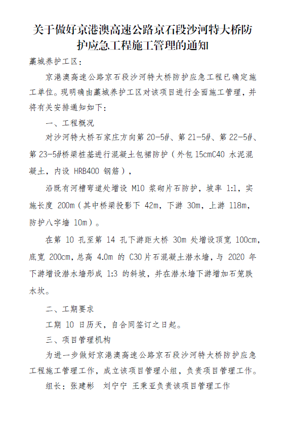 關于做好京港澳高速公路京石段沙河特大橋防護應急工程施工管理的通知