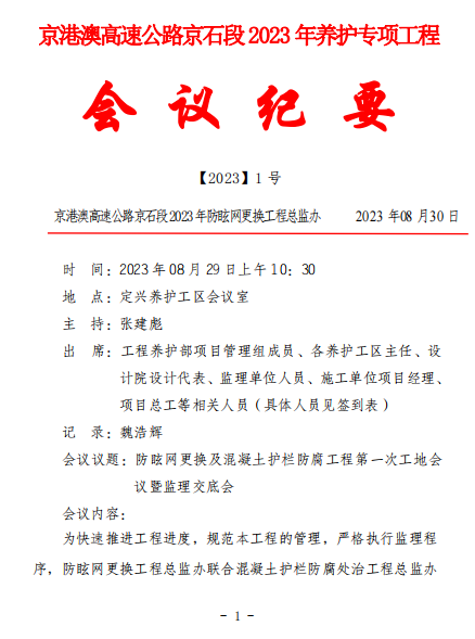 【2023】1號防眩網(wǎng)更換及混凝土護欄防腐工程第一次工地會議暨監(jiān)理交底會會議紀(jì)要