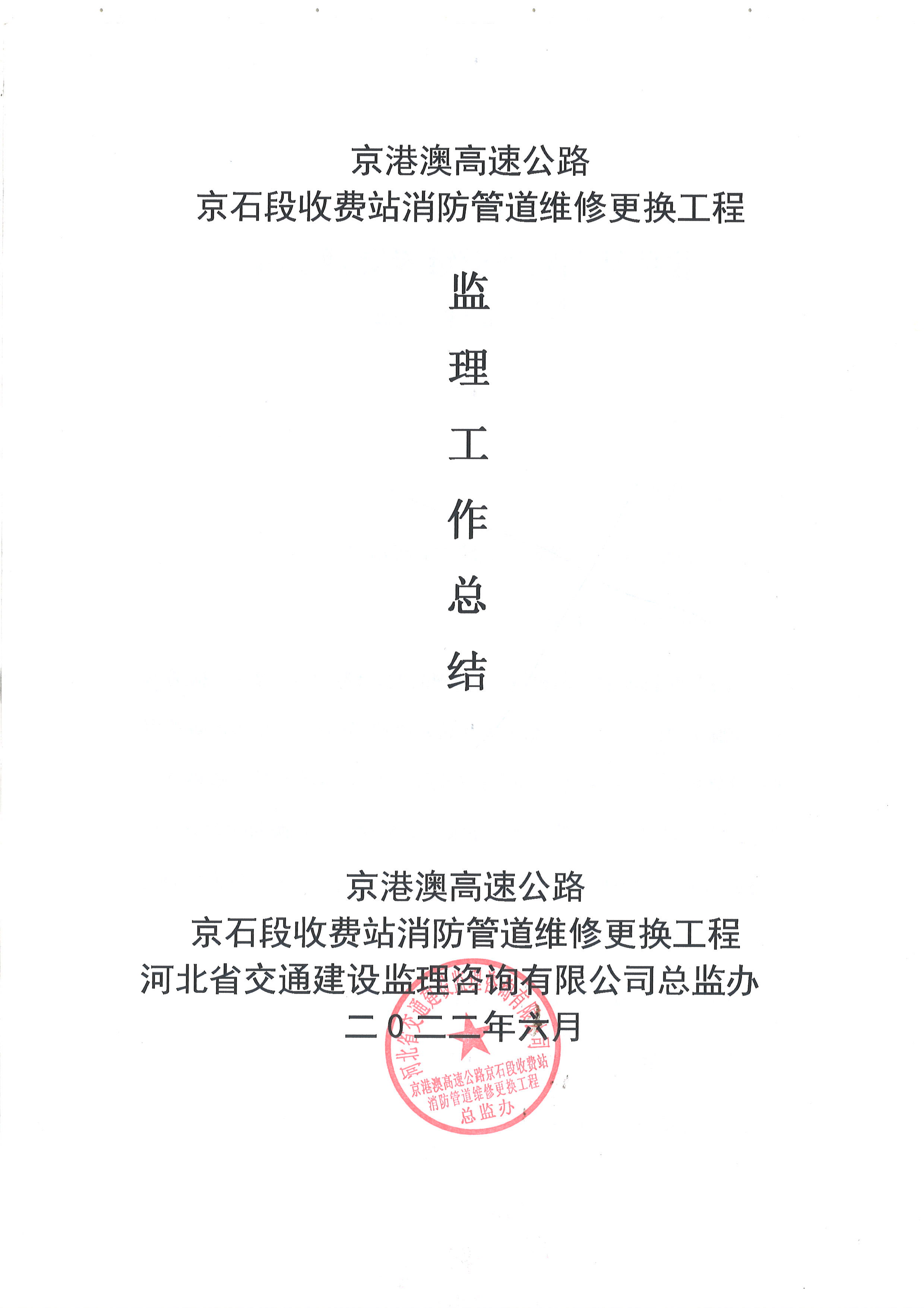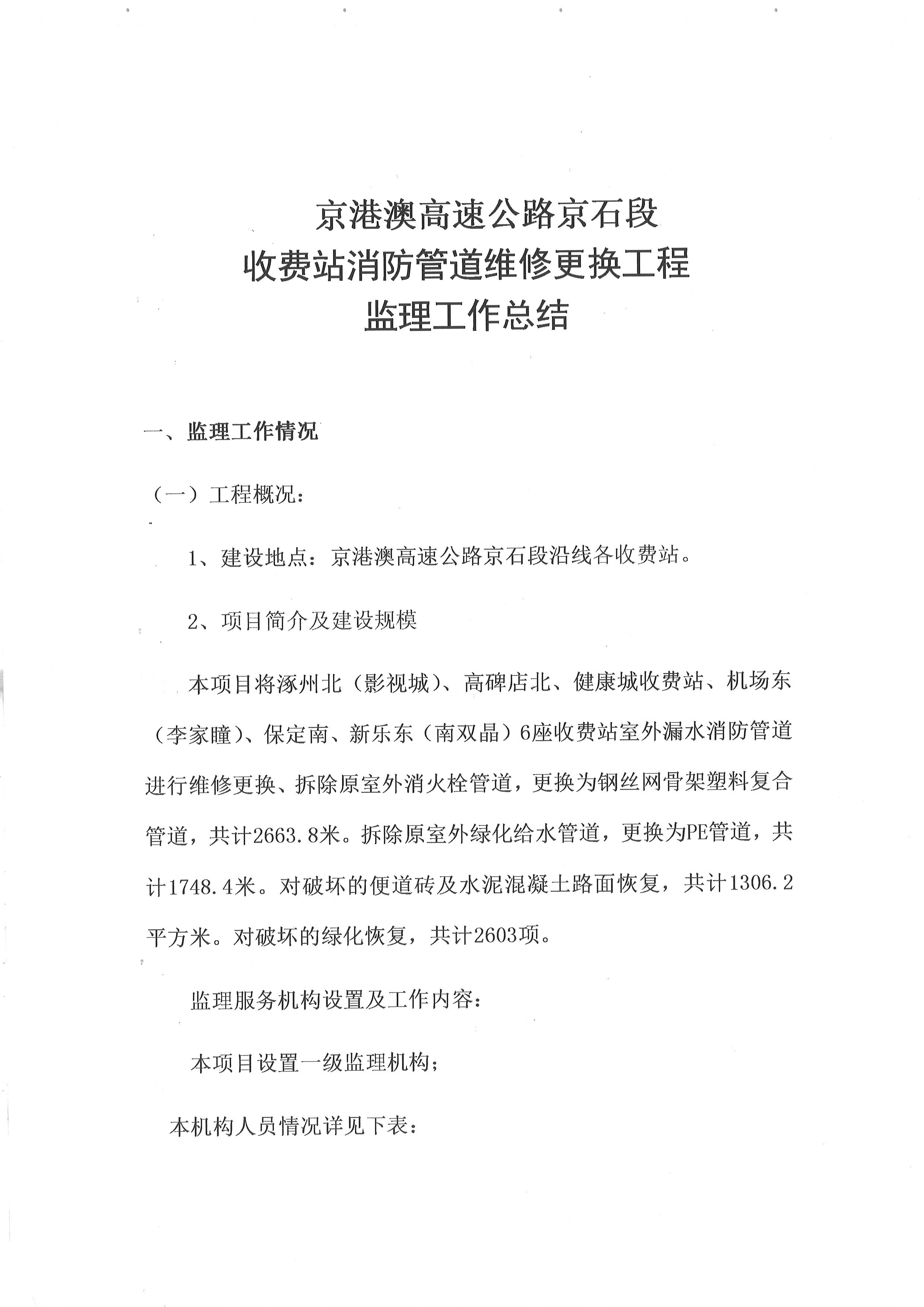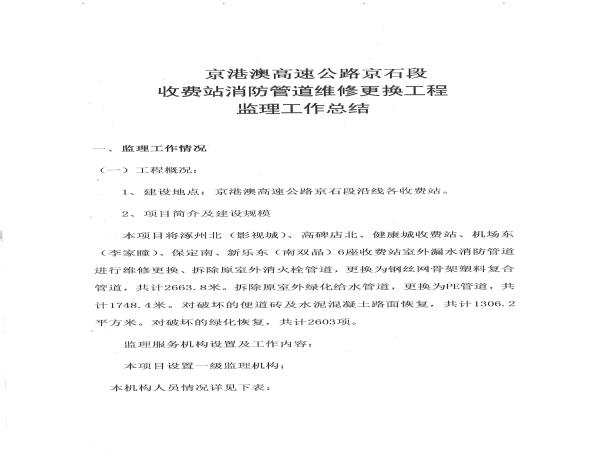 2022年京港澳高速京石段收費(fèi)站消防管道維修更換工程監(jiān)理工作總結(jié)