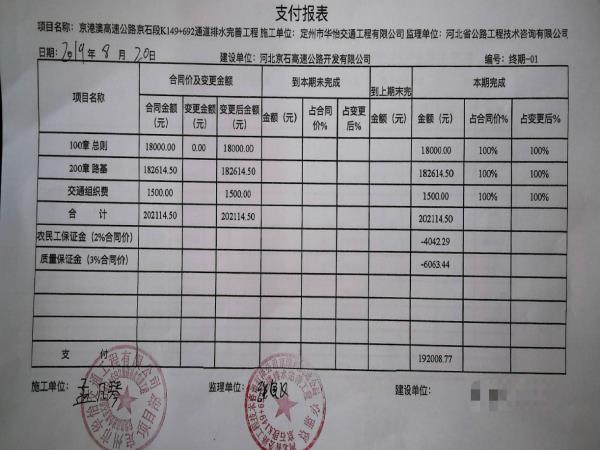 京港澳高速公路京石段K149+692通道排水完善工程支付證書