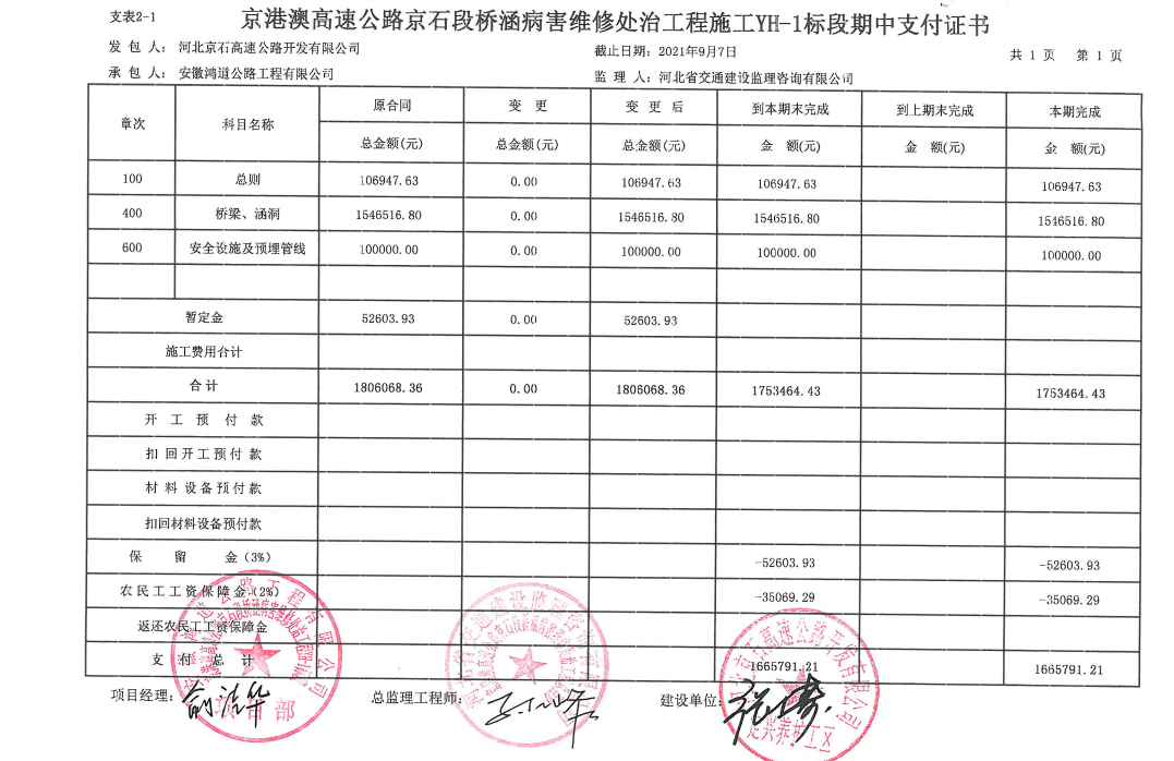 京港澳高速公路京石段橋涵病害維修處治工程YH-1標(biāo)段支付證書