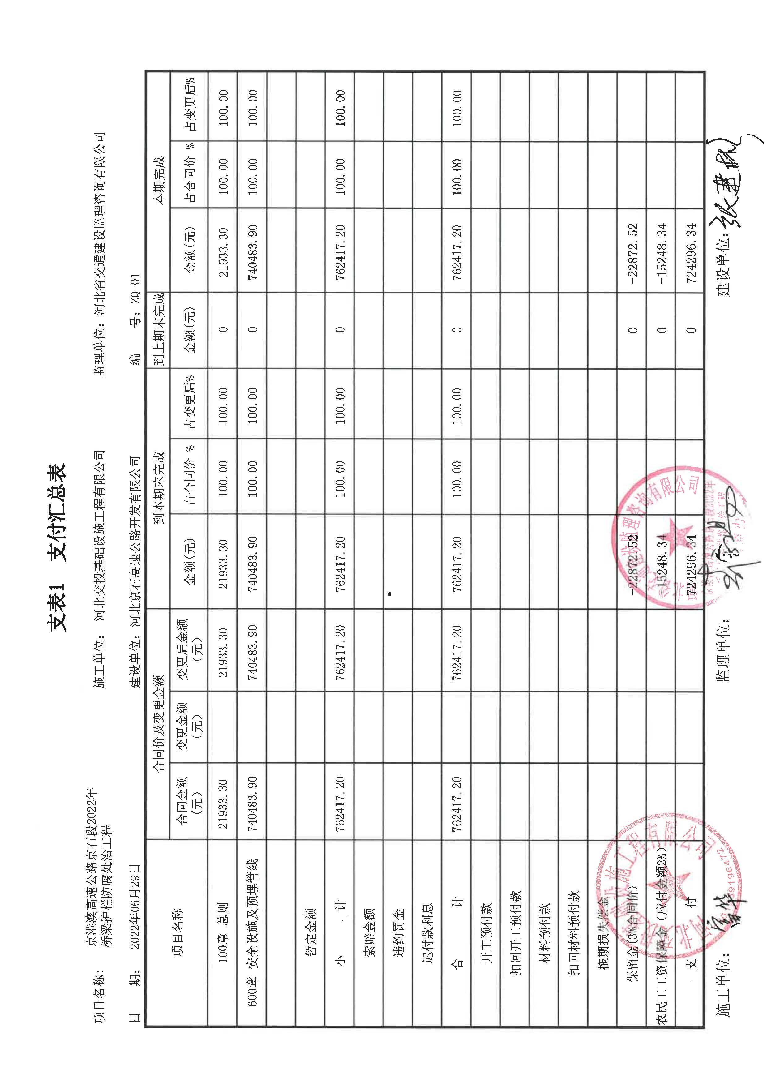 2022年橋梁護(hù)欄防腐處治工程支付證書