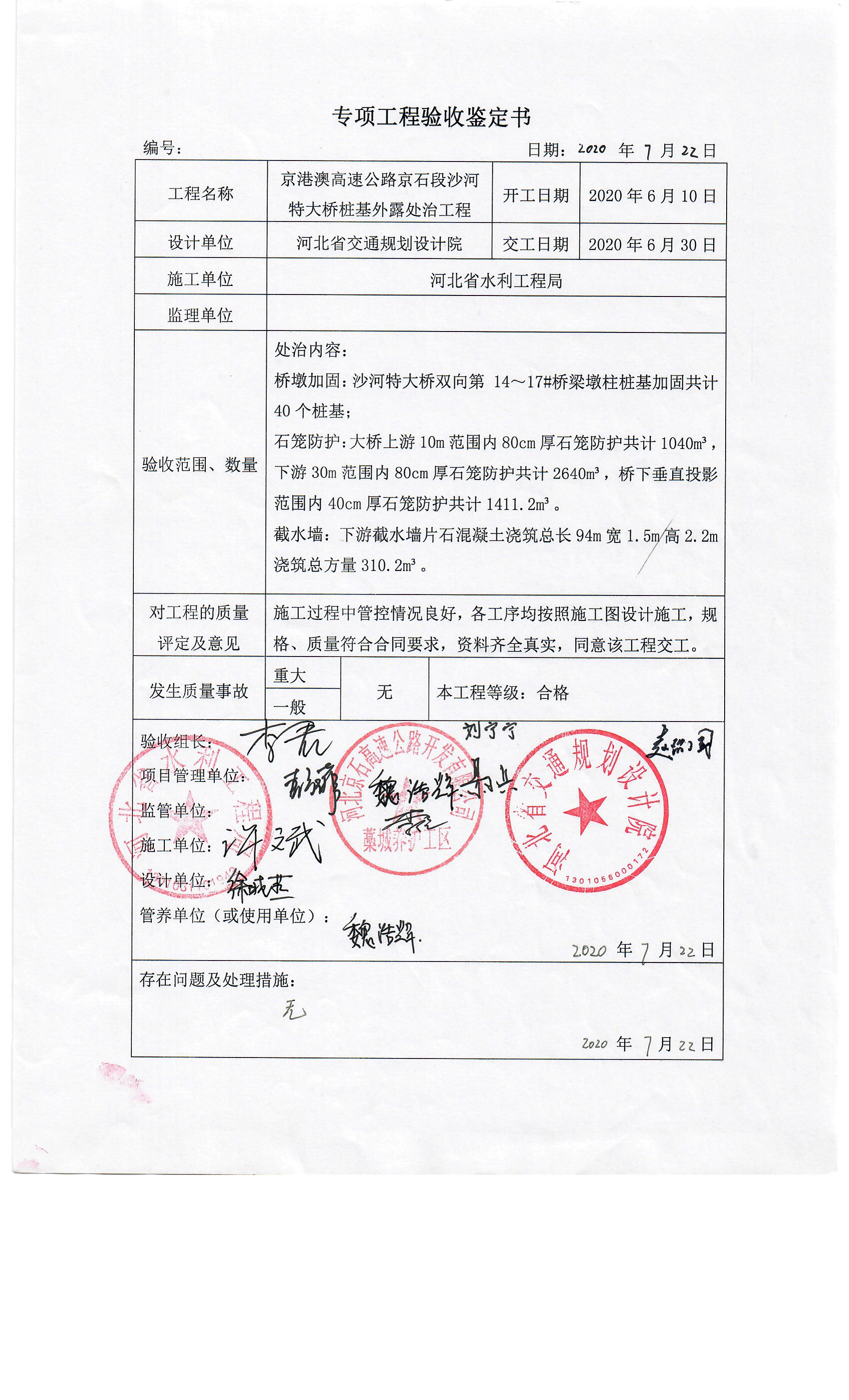 京港澳高速公路京石段沙河特大橋樁基外露處治工程驗(yàn)收證書