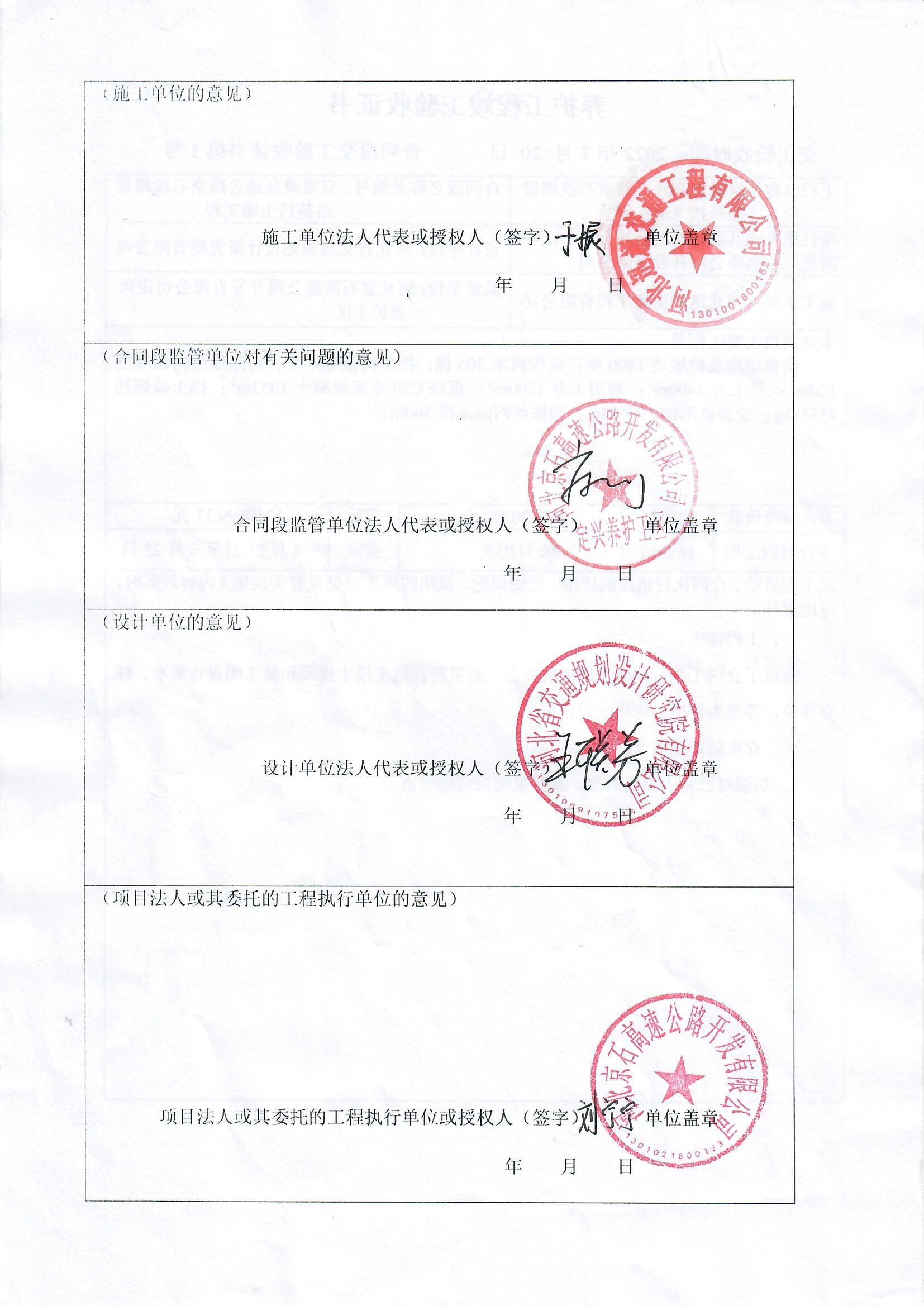 京港澳高速公路京石段增設(shè)路基擋土墻工程驗(yàn)收證書