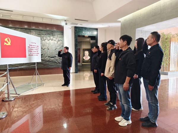 在李大釗紀(jì)念館前,全體黨員整齊列隊(duì),面向黨旗莊嚴(yán)宣誓,重溫入黨誓詞。鏗鏘誓言回蕩在廣場(chǎng)上空,彰顯了同志們堅(jiān)守初心、勇?lián)姑膱?jiān)定信念。