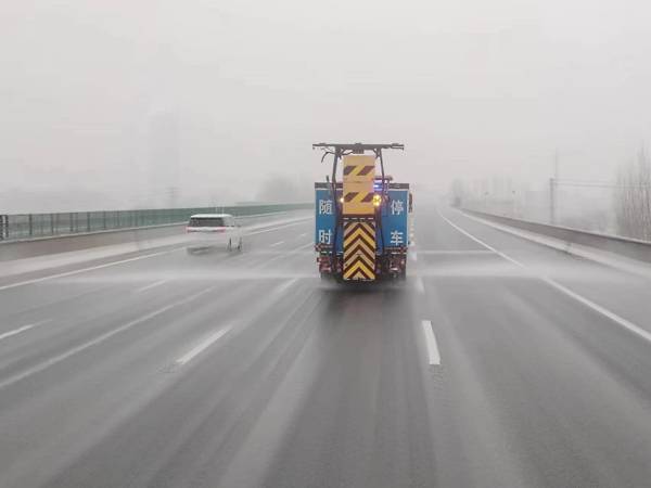 此次降雪環(huán)境溫度較高,除雪保暢重點由化雪變?yōu)榉乐怪攸c路段路面結(jié)冰。針對橋梁、大長縱坡等重點路段,各工區(qū)根據(jù)建立的臺賬,突出重點,精準施策,采用融雪劑和融雪液相結(jié)合的方式進行撒布,防止路面結(jié)冰。
