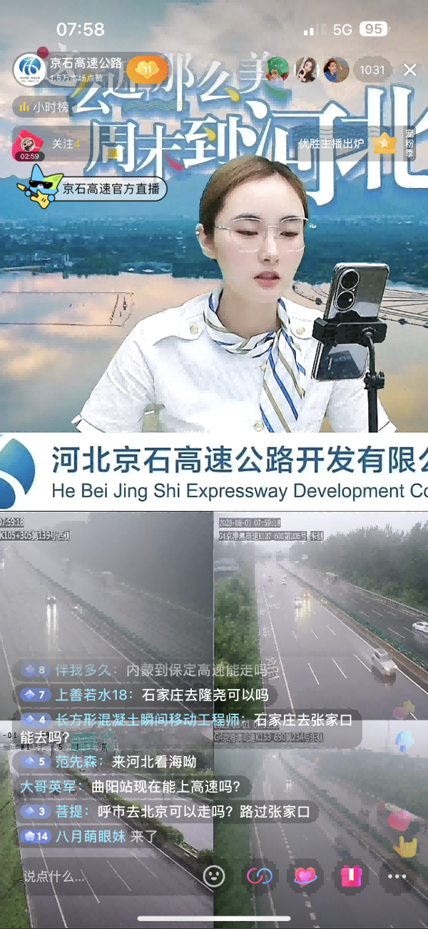 受臺(tái)風(fēng)“杜蘇芮”影響,河北省出現(xiàn)極端惡劣天氣,京石高速全線強(qiáng)降雨來(lái)襲,京石高速抖音路況直播間增加直播場(chǎng)次,延長(zhǎng)直播時(shí)長(zhǎng),3名主播輪番出鏡,從早上7點(diǎn)到22點(diǎn)不間斷進(jìn)入直播,為求助的司乘提供最新通行訊息,為司乘保駕護(hù)航。