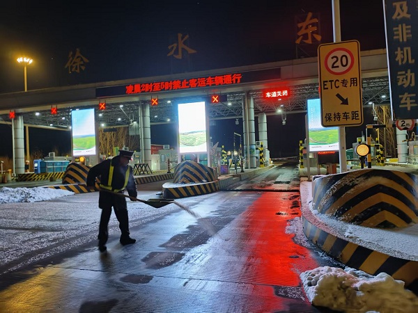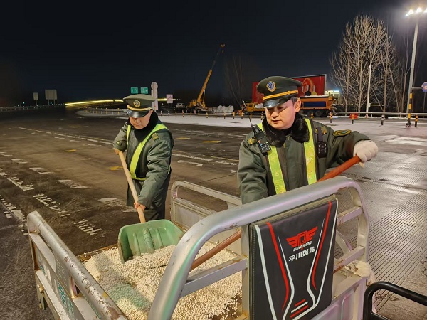 為了防止夜間低溫導(dǎo)致路面結(jié)冰,值班人員全員出動(dòng),拿起鐵鍬和融雪劑,在每一條車(chē)道上細(xì)致撒布。冰冷的融雪劑在他們手中傳遞,而他們心中想的,只有讓每一輛過(guò)往的車(chē)輛都能平安駛過(guò)。